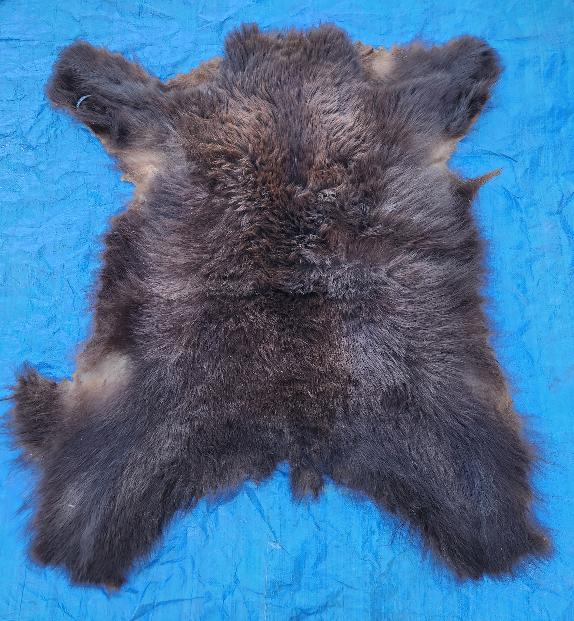 Raw black bear hide. Has been thoroughly fleshed, dried, and fur washed of most dirt and blood. ~36" wide x 41" long. Super heavy and dense fall fur. Longest fur is ~4" on the front half, rest of fur is ~3" long on the back half of the hide. Has tail attached. Hide is NOT tanned, making the fur desirable by many fly tiers. Skin would make great leather or raw hide. Has IDFG pelt tag attached. Dark chocolate color.