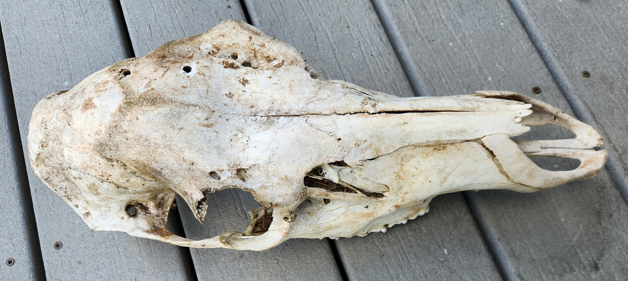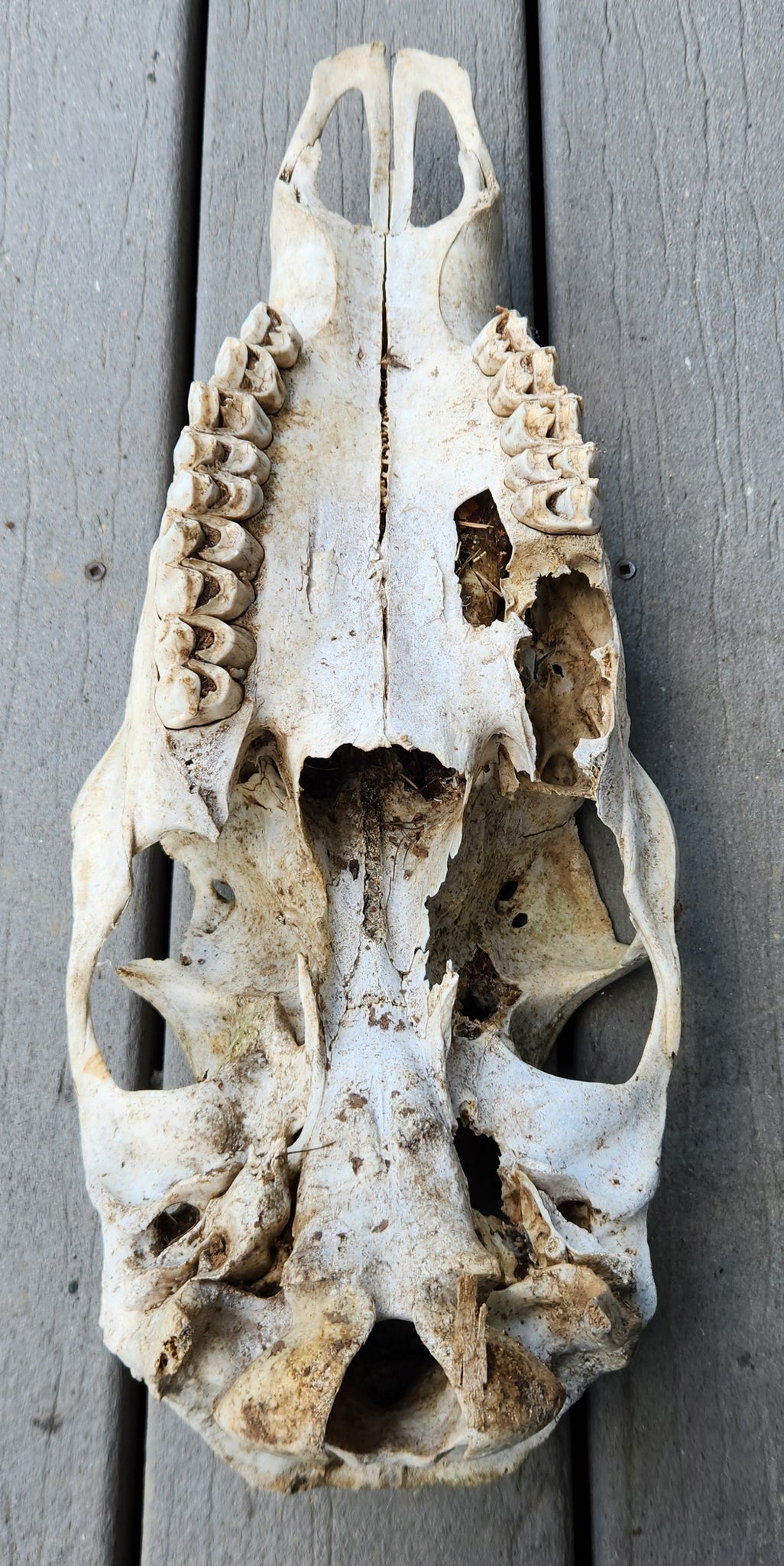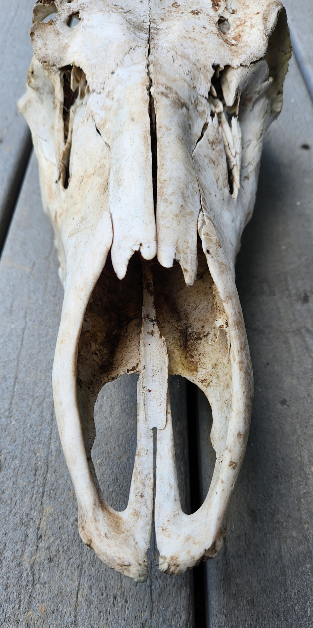 Idaho Rocky Mountain cow (female) elk skull. ~17.5" in length. Upper skull only. Naturally nature cleaned within the mountains of Idaho. This skull is from an adult elk. Has various predator bite marks throughout - see pictures. Two rear molars are missing as a result of predators chewing on the skull. Sold in the as in condition. Has some soil staining and pine needles existing within the nasal cavity. Great for nature displays, flower gardens, hobbit type exhibits, etc.