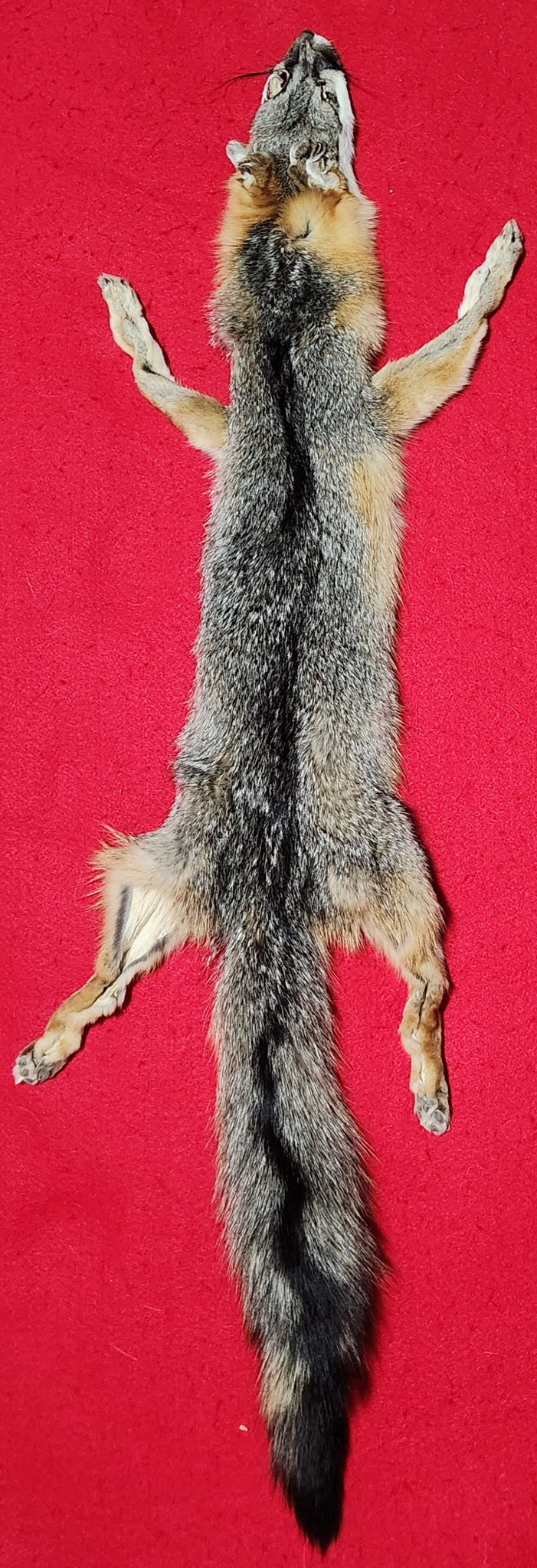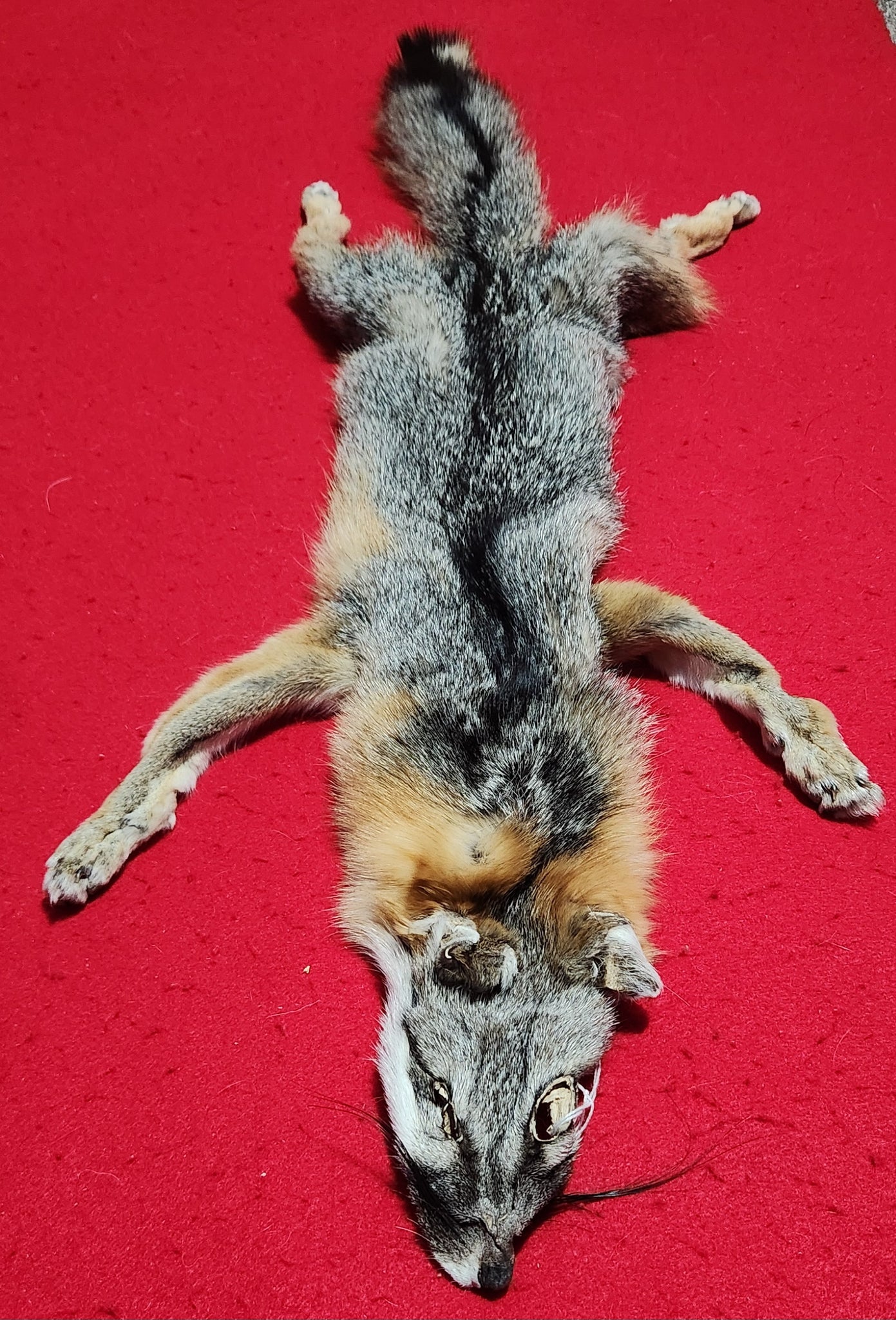 SW Oregon female grey fox. Heavy November quality fur. Large size. 43" total length, 26" nose to base of tail. Would be listed as taxidermy quality except has ~three less than 1/8" holes in the snout. Ear cartilage is intact and ears were not turned, but no slippage is present. Both eyes are slightly enlarged. Has feet with claws attached. Complete tail attached. Genitalia is not present. Exceptionally nice fox pelt. Beautiful silky soft fur!