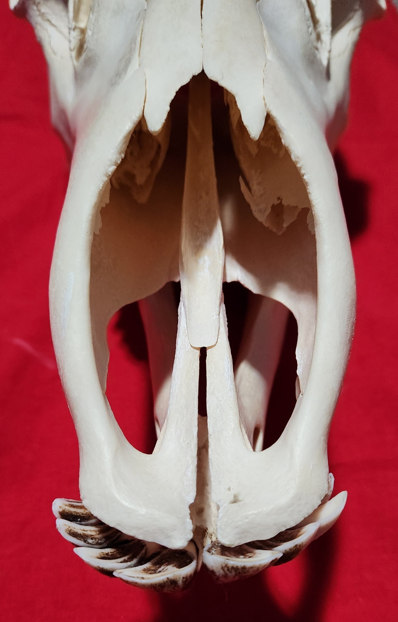 Large size Idaho Rocky Mountain cow (female) elk skull. 16.5" in length. BEETLE cleaned, degreased, and whitened. Some of the nasal turbinate structures are slightly missing. Has complete pterygoids. Has white color canines intact. All teeth are intact; a couple of the incisors are whiter than the rest. Good skull for specimen use.
