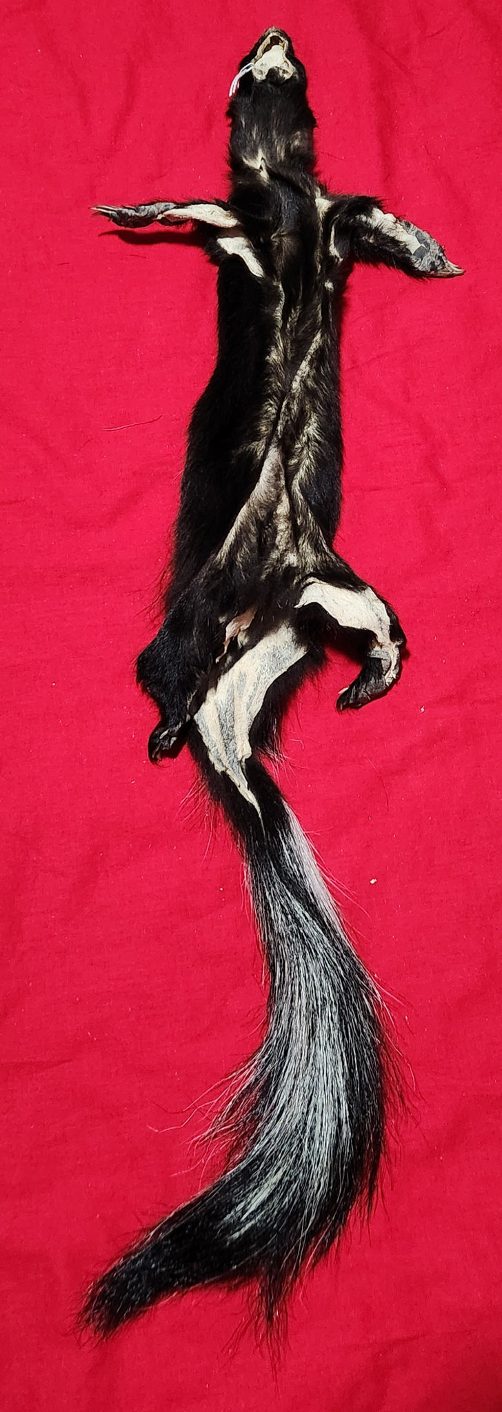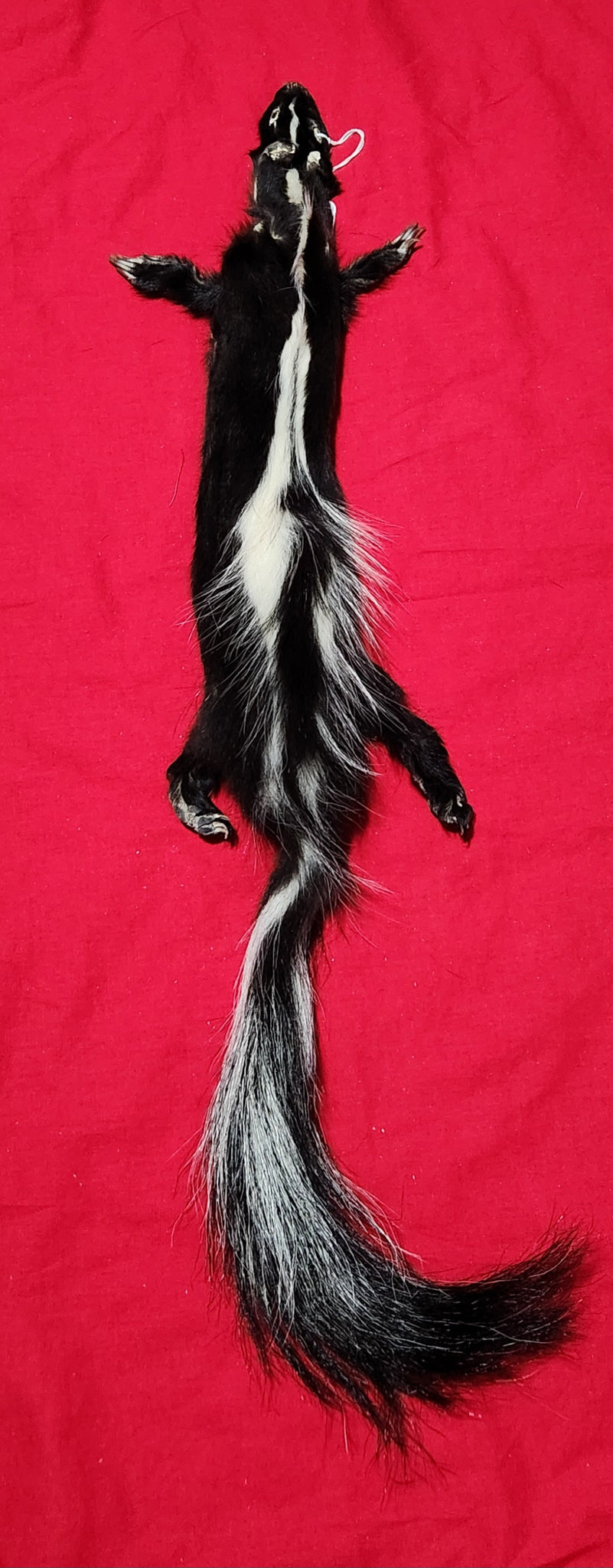 Medium Idaho skunk hide. Male. 17" nose to base of tail, 31" to tip of tail. Summer type fur. Nice long guard hairs around white stripes, short on the rest of the body. No underfur. Fur is a little thin on belly and most of the underside of this skunk. Thin tail but fur has nice coverage. Has feet, claws, ears turned, lips split, etc. Has complete genitalia. Very nice and long claws on this skunk. Has a 5/8" diameter hole in the underside of neck and a torn right ear tip. This skunk was skinned for taxidermy work but is not graded as such due to condition of fur. Good specimen skin or for repair material.
