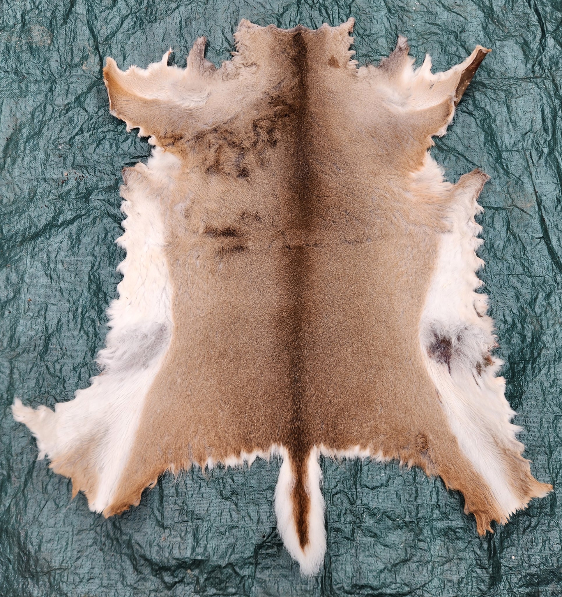 Raw whitetail deer hide. 49" total length; 40" neck to base of tail; 31" width across abdomen. Thoroughly fleshed and air dried. Has November quality hair. 1.5" length hair on body; 3" hair on tail. Please see pictures for any defects in leather. Has the complete tail attached. Can be made into leather or hair scraped off to make rawhide. Would also make a great brain tanning project. Medium to light brown color.